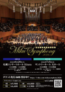 初音ミクシンフォニー2026 Posted on 2026年2月22日2026年3月18日 by BS_MEMBER 2026年6月20日(土) 14:00開演 札幌コンサートホール Kitara 大ホール (北海道) ⇒ flyer ⇒ X <出演> 佐々木新平 (指揮) 札幌交響楽団 藤田 咲 (司会) <プログラム> ※札幌、東京公演は一部演奏曲が異なります <お問合せ> 札幌公演 WESS info@wess.co.jp
